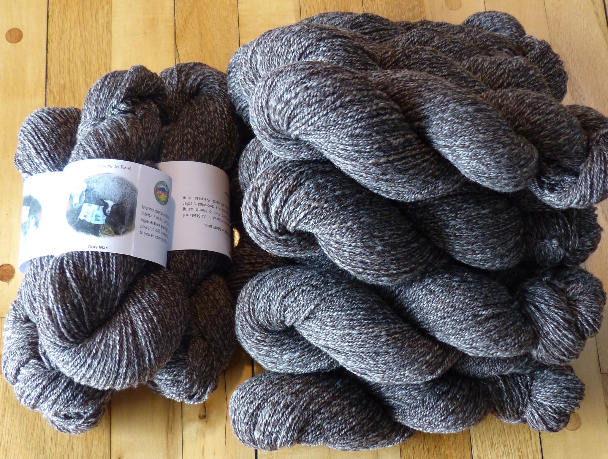 Skin soft merino, smooth as butter cream. This yarn contains fiber from all of our gray sheep - light, medium, and dark gray. It knits up dark with splashes of silver.
